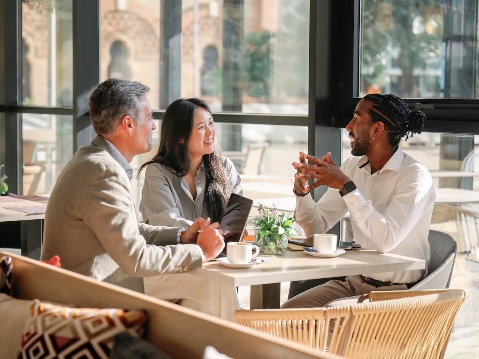 A sunlit café overlooking leafy streets, where gentle breezes softly flow and warm conversations always linger longer than the coffee.
